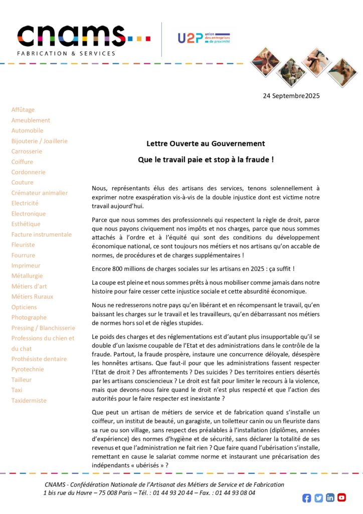 La Confédération Nationale de l’Artisanat des Métiers et des Services (CNAMS) a publié une lettre ouverte au Gouvernement pour dénoncer les charges excessives, la concurrence déloyale et le laxisme face à la fraude. En Île-de-France, les artisans se mobilisent pour faire entendre leur voix et défendre un environnement économique juste et équitable. Découvrez les revendications portées par la CNAMS et comment la région s’engage à leurs côtés.